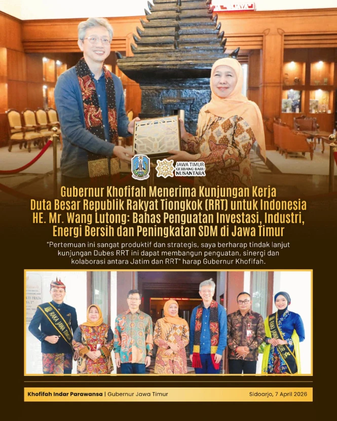 BISNISINSPIRE.COM – SIDOARJO, 8 APRIL 2026 – Gubernur Jawa Timur Khofifah Indar Parawansa membahas penguatan kerja sama strategis di berbagai sektor, mulai dari investasi, industri, energi terbarukan, hingga pengembangan sumber daya manusia (SDM) saat menerima kunjungan kerja Duta Besar Republik Rakyat Tiongkok (RRT) untuk Indonesia HE. Mr. Wang Lutong di Gedung VIP Bandara Juanda, Sidoarjo, pada Selasa (7/4).