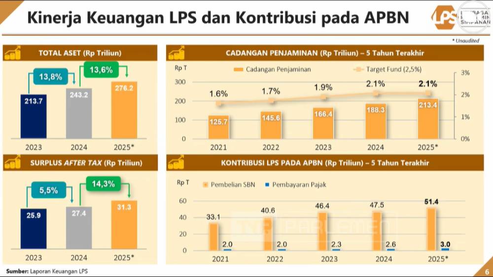 Total aset LPS tercatat meningkat dari Rp213,7 triliun pada 2023 menjadi Rp243,2 triliun pada 2024, dan diproyeksikan mencapai Rp276,2 triliun pada 2025. Kenaikan ini mencerminkan pertumbuhan sebesar 13,8 persen pada 2024 dan 13,6 persen pada 2025.