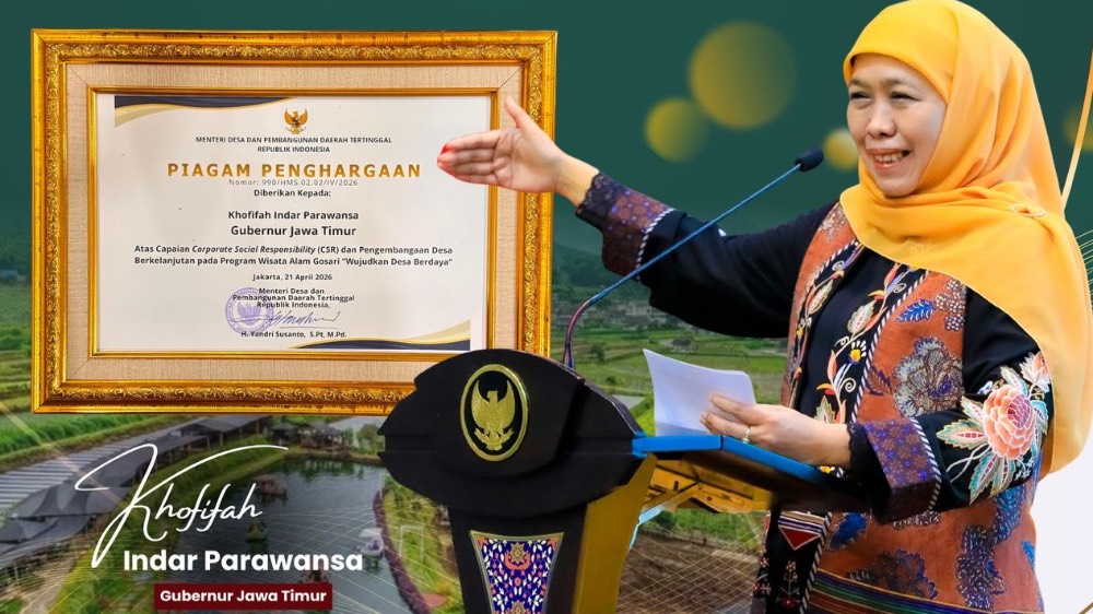 BISNISINSPIRE.COM – Surabaya, 24 April 2026 – Gubernur Jawa Timur Khofifah Indar Parawansa menerima penghargaan Corporate Social Responsibility (CSR) dan Pengembangan Desa Berkelanjutan (PDB) Award 2026 dari Kementerian Desa dan Pembangunan Daerah Tertinggal. Penghargaan ini diraih melalui keberhasilan Program Wisata Alam Gosari bertajuk “Wujudkan Desa Berdaya”.
